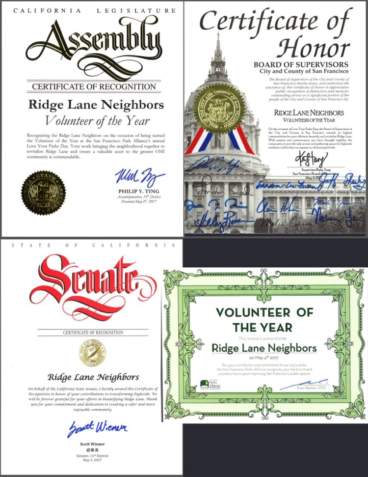 We wanted to share the lovely certificates RLN received last week for being chosen Volunteer of the Year at SFPA’s Love Your Parks day event. From Top Left to Bottom Right they are from the California Assembly, the SF Board of Supervisors, The California Senate, and the SF Parks Alliance.