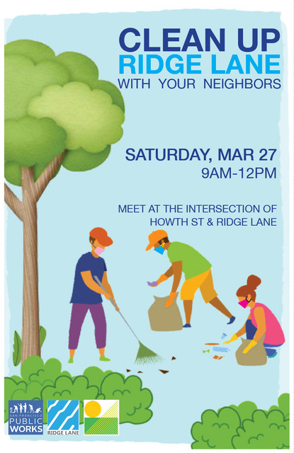 Please join neighbors for a Ridge Lane Clean Up day on Saturday, March 27 from 9a-12n. Gloves, trash bags and tools will be available; please wear your own masks and practice social distancing.