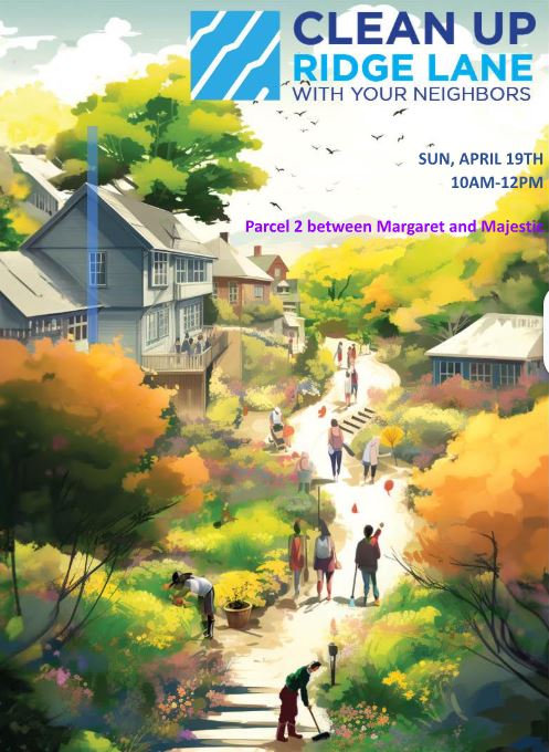 Hi Neighbors! Please join us for the next Ridge Lane clean up day on Sunday, March 19th from 10AM – 12PM. We are gonna be working mainly on Parcel 2 between Margaret and Majestic.