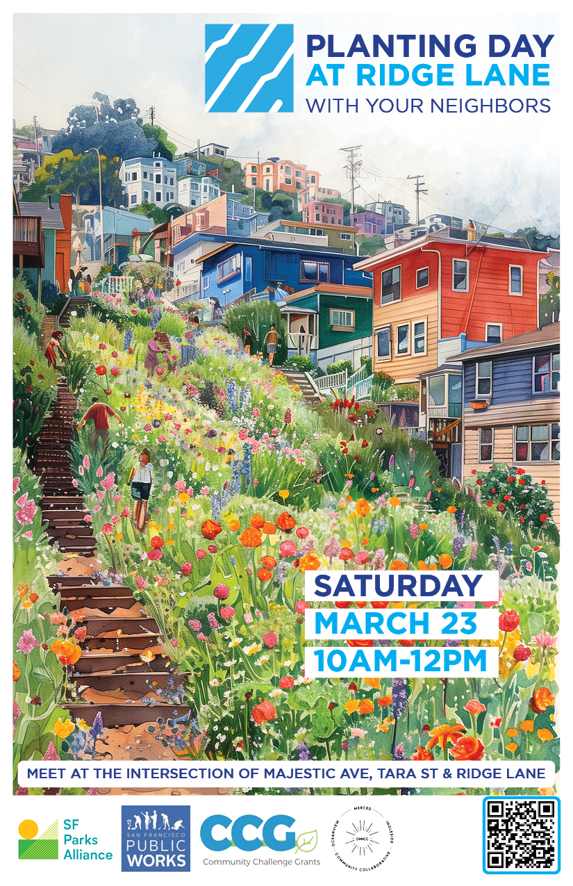 Hi Neighbors! Please join us for the a Ridge Lane planting day! Saturday, March 23rd from 10AM to 12PM. Join neighbors planting some new plants up the lane at the intersection of Ridge Lane and Majestic Ave. If you can, please bring some tools — gloves, brooms and compost bags will be provided. Plants willContinueContinue reading “Join us for a Planting Day! Saturday, March 23 10AM-12PM”